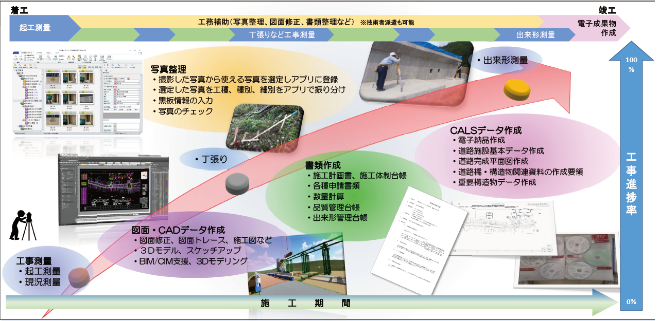 舗装工事、橋梁架設工事、高架橋耐震補強工事、トンネル工事、ダム工事、電線共同溝設置工事、ロードヒーティング設置工事、宅地造成工事、空港内工事、その他
